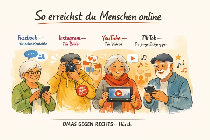 Auf Instagram hat @omasgegenrechts über 136.000 Followerinnen. Das bedeutet: 136.000 Menschen sehen jedes Bild, jeden Text, jede Geschichte. Ein einziger Post kann Tausende erreichen — in Sekunden, ohne Druckkosten, ohne Briefmarken.